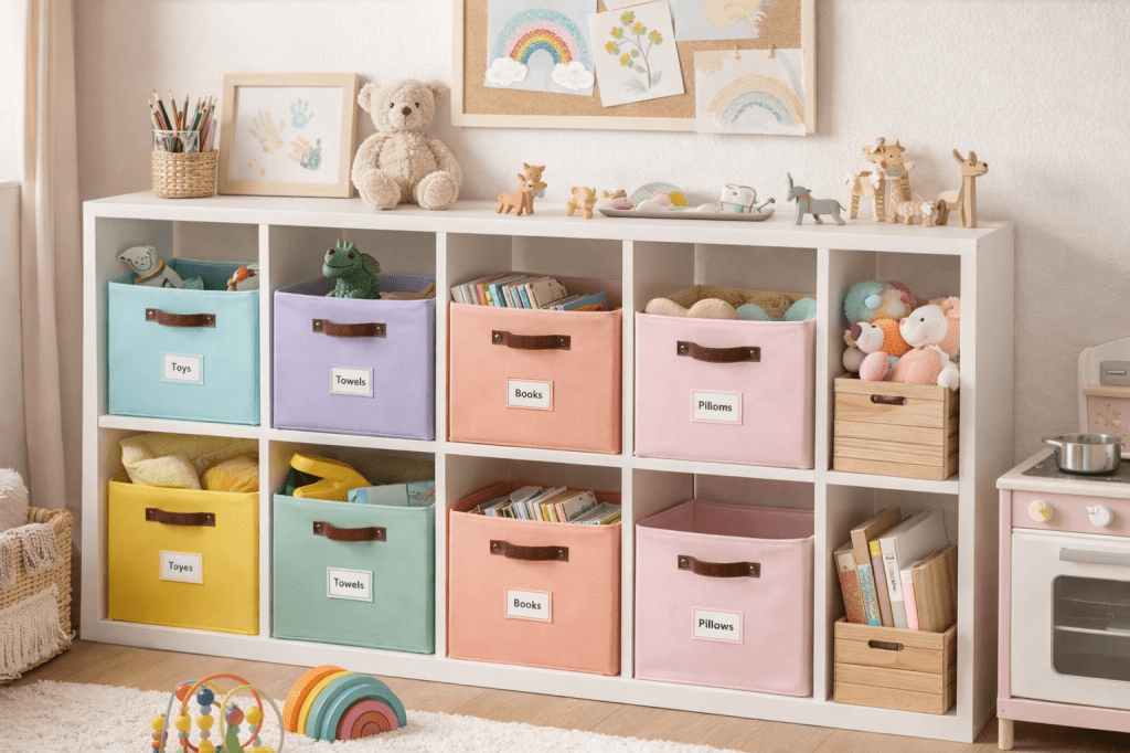 👉 Labeled Baskets + Catch-All Bins
